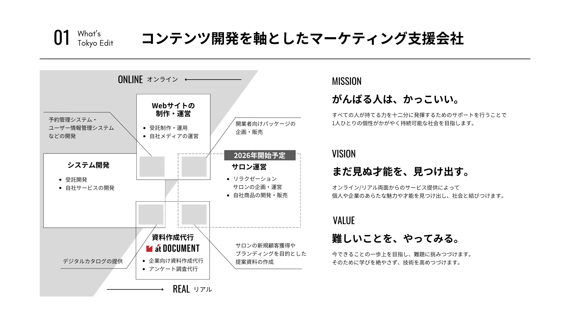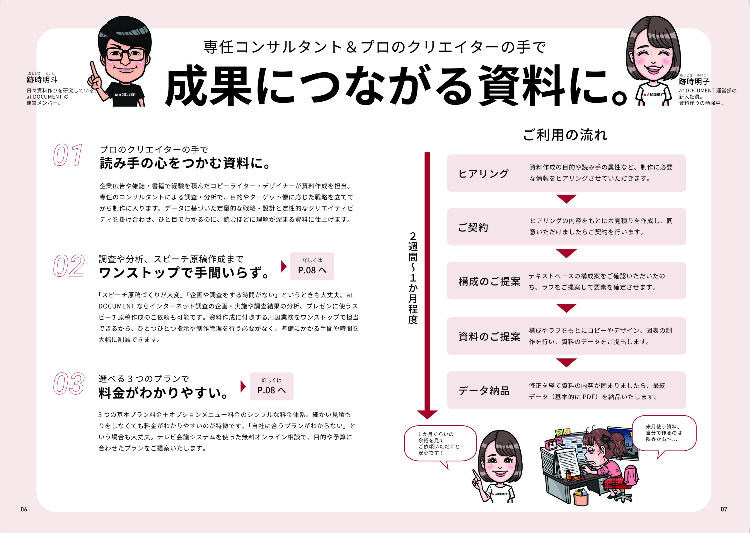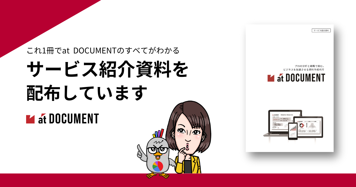 緻密な戦略で“勝てる”資料を。at DOCUMENTはプロのコンサルタントと資料作成専門クリエイターが手がける「戦略型資料作成代行サービス」です。構成からデザイン、コピーまでこだわり抜き、ひと目でターゲットの心をつかむ資料に仕上げます。