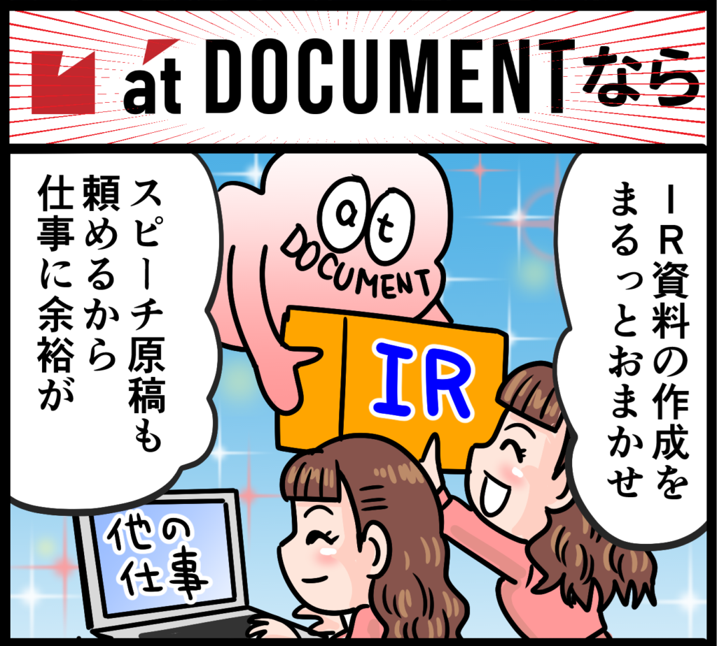そんなときに重宝するのが、atDOCUMENT。広報資料の作成をまるっと任せられるから、日々の業務に余裕が生まれます。金融・経済の専門コンサルタントが在籍しているから、株主目線が求められるIR資料の作成にも対応可能。プレスリリース作成は翌日納品も可能で、スピーディーな発信を実現できます。