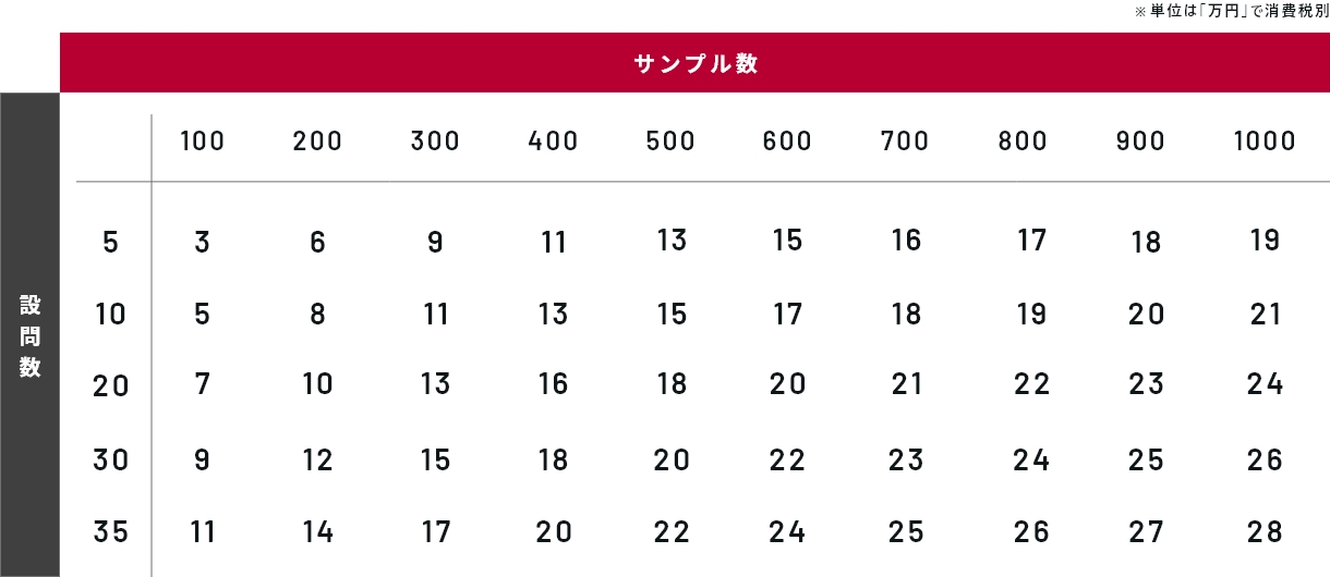 ※サンプル数・設問数の上限はありません。表にない条件での調査をご希望の場合は個別にお問い合わせください。